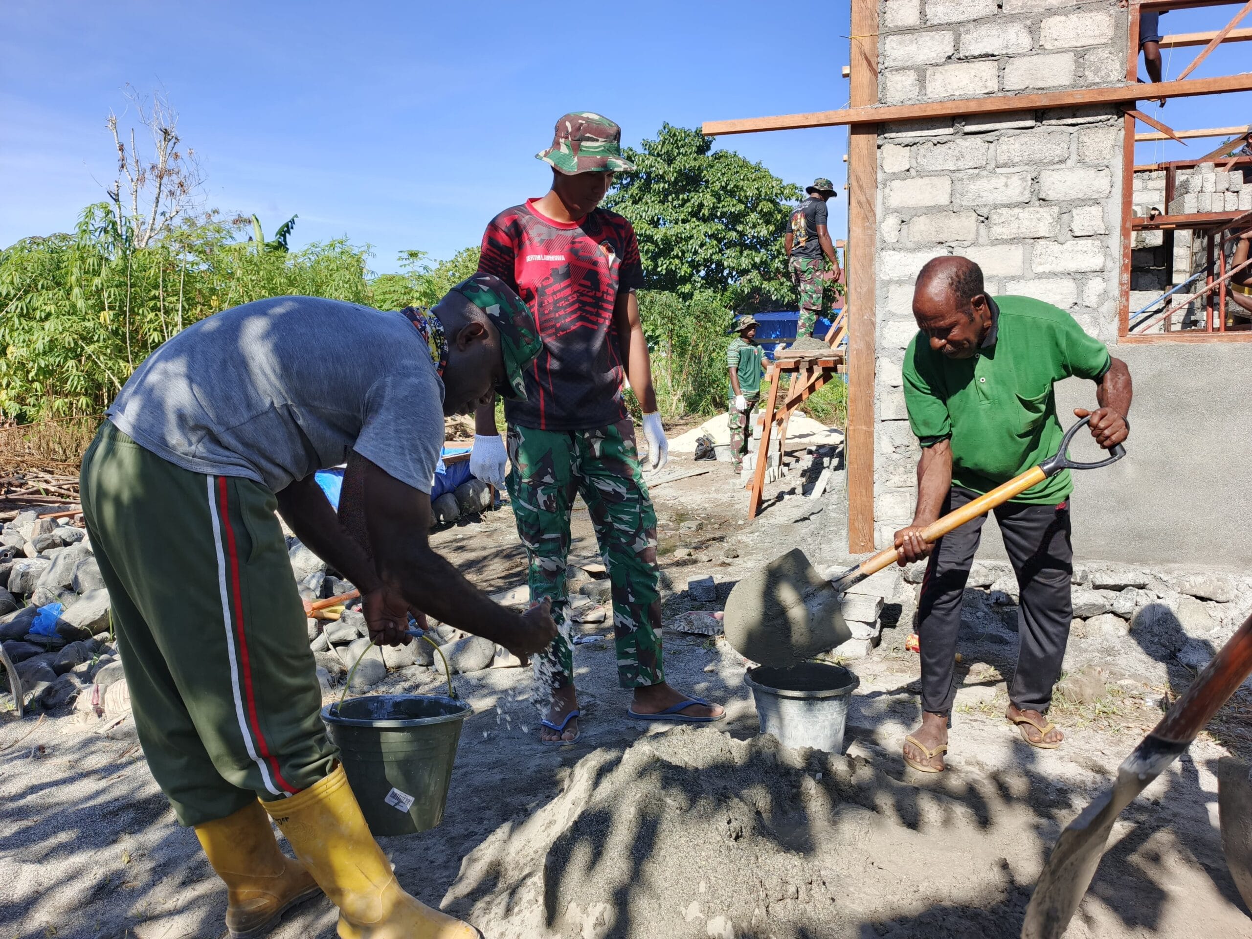 Inilah yang terlihat dari kekompakan warga dan TNI dalam pemasangan batu tela dinding rumah milik warga di Kampung Tanah Rubuh, Distrik Manokwari Utara, Kabupaten Manokwari, senin (27/04/2026).