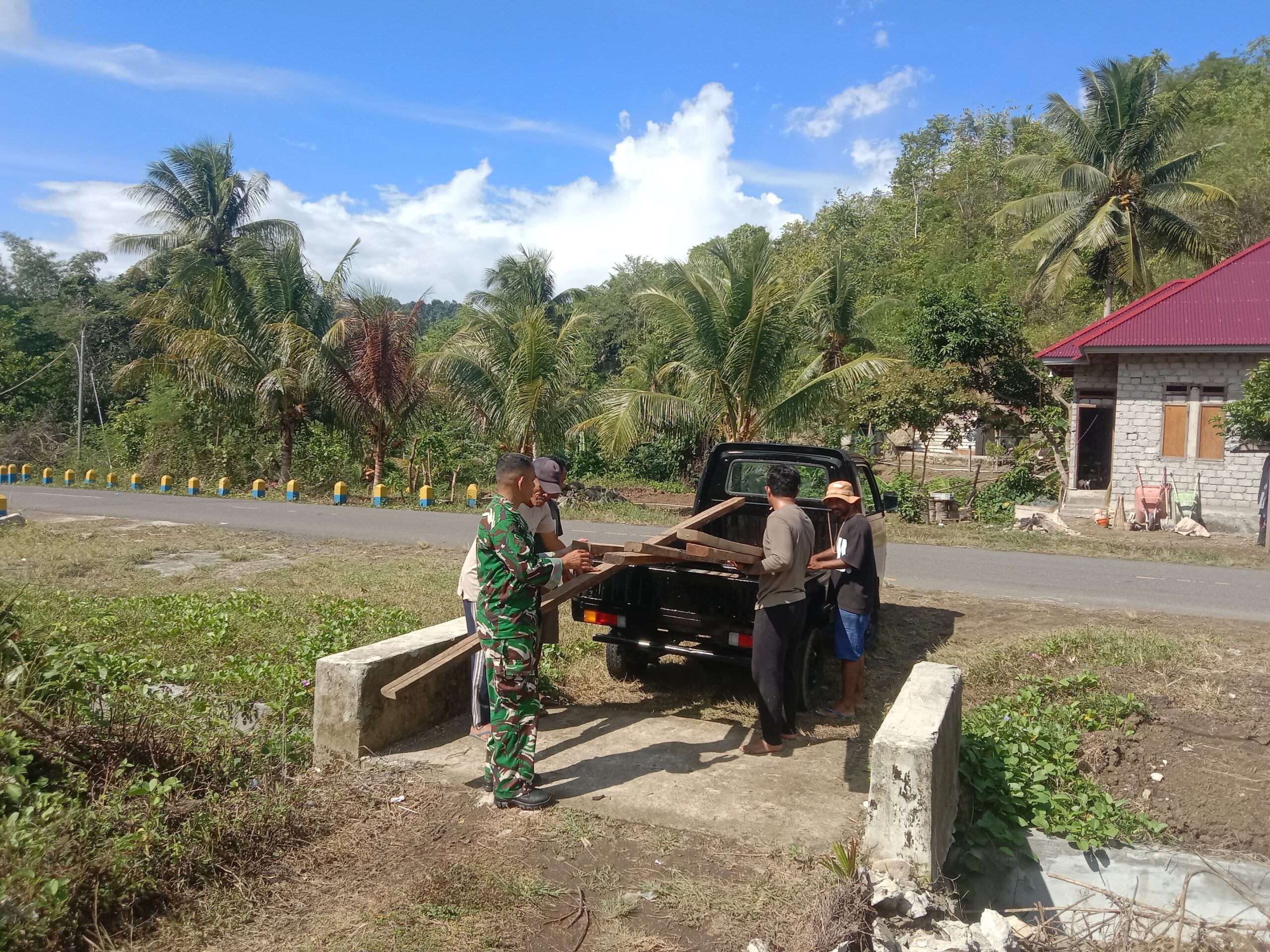 Personel Kodim 1505/Tidore bersama warga setempat akan bergotong royong dalam proses pembangunan, mencerminkan semangat kebersamaan dan sinergi antara TNI dan rakyat.