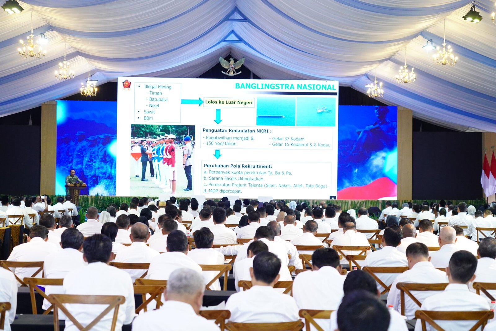 Selain itu, Panglima TNI juga menyampaikan penguatan struktur pertahanan melalui pembentukan satuan-satuan baru, termasuk rencana pembentukan 37 Komando Daerah Militer (Kodam), 15 Pangkalan Utama TNI Angkatan Laut (Lantamal), serta 8 Pasukan Marinir (Pasmar) di berbagai wilayah Indonesia.